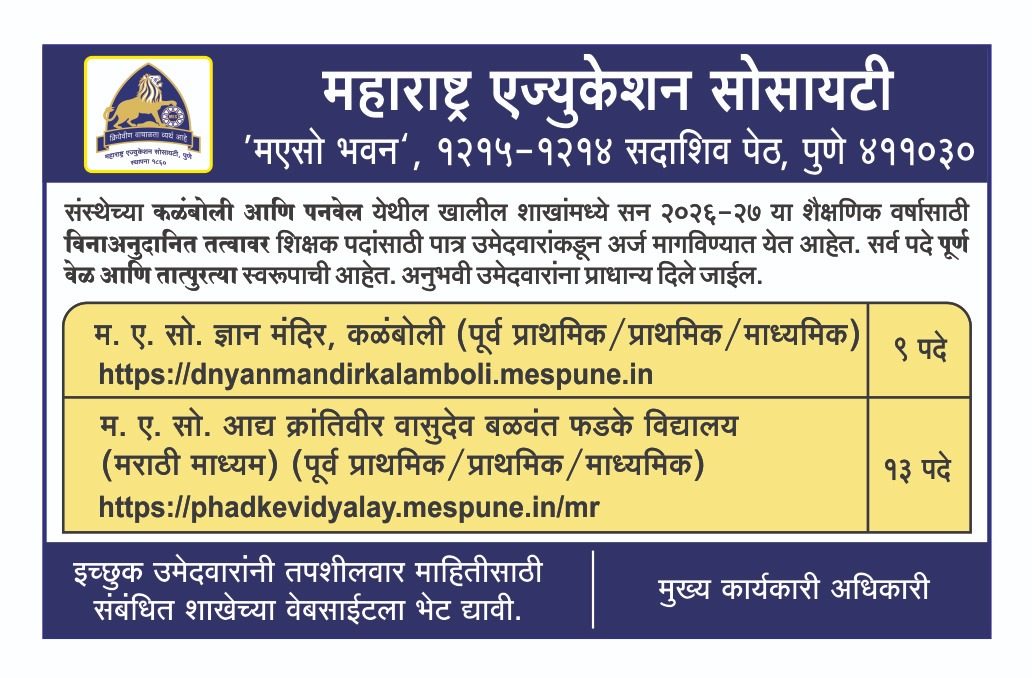 राष्ट्रीय शिक्षण देण्याच्या उद्देशाने कै. वामन प्रभाकर भावे, आद्यक्रांतिवीर वासुदेव बळवंत फडके आणि कै. लक्ष्मण नरहर इंदापूरकर यांनी १८६० साली महाराष्ट्र एज्युकेशन सोसायटीची स्थापना केली. ‘मएसो’ने शिशु शाळेपासून उच्चशिक्षणापर्यंत आणि ..